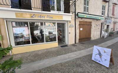 During a Sunday stroll through the heart of Aiguines village, we had the wonderful surprise of attending the opening day of the "Chat Bleu" painting gallery/studio located in the heart of the Provençal village of Aiguines. We were the second visitors to the gallery.