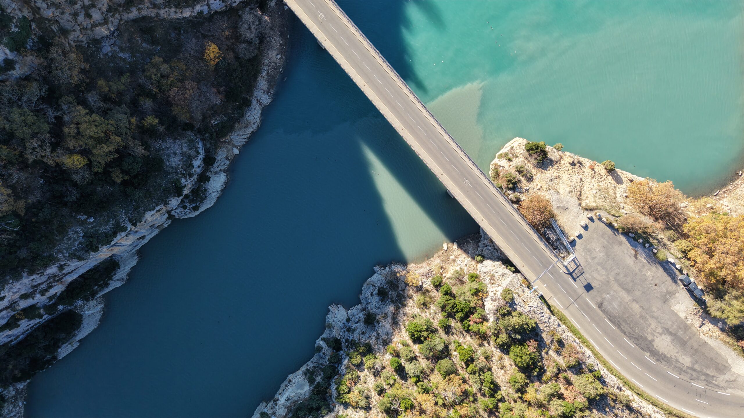 Une fois le pont franchi (visuellement), les images deviennent immédiatement plus “gorges” : les rives se redressent, la végétation s’accroche aux pentes, et la rivière prend une profondeur de champ très photogénique. C’est un endroit parfait pour montrer la naissance du canyon sans aller chercher des kilomètres de parois : tout est déjà là, mais dans une version “douce” et accessible, idéale pour un reportage drone. En plan large, tu racontes la progression : le lac derrière, le couloir devant, et ce sentiment d’aspiration vers l’intérieur du Verdon. En plan plus bas (tout en restant prudent), tu captes les détails de la surface : nuances laiteuses près des bords, taches plus sombres dans le chenal, dessins des rochers et des herbiers selon la saison.