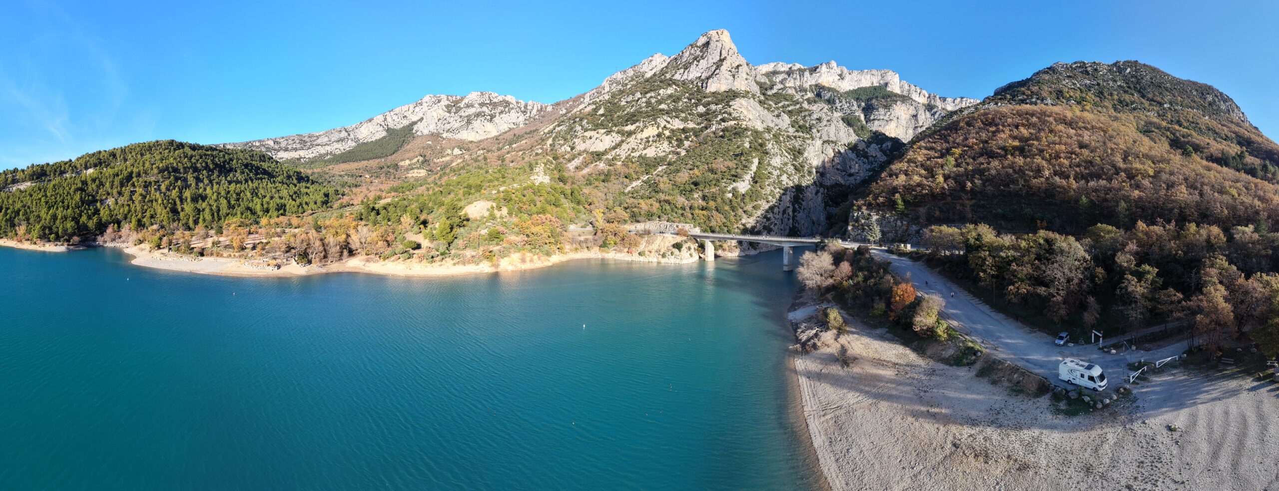 À l’échelle du sol, l’entrée des Gorges du Verdon se résume souvent à un moment de passage : on arrive, on se gare, on descend vers l’eau, puis on part pagayer ou pédaler sans forcément comprendre l’architecture complète du site. Dès que le drone prend de la hauteur, tout se réorganise : la vallée devient une scène, le Verdon trace une ligne nette, et le paysage raconte la transition entre l’espace ouvert du lac de Sainte-Croix et le couloir minéral du canyon.