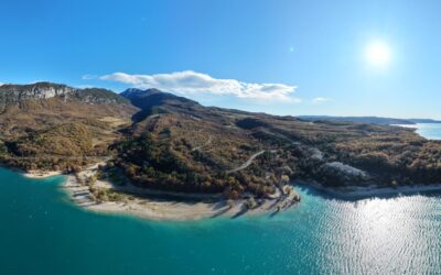 Vu du drone, l’eau prend des nuances de bleu et de turquoise que l’on ne perçoit pas toujours depuis la rive, les courbes du lac se dessinent avec précision, et l’on mesure d’un seul regard la proximité entre le village d’Aiguines, les plages, les ports de plaisance et l’entrée des Gorges du Verdon. Toutes les images et vidéos de ce reportage sont réalisées dans la partie amont du lac, à moins de quinze minutes de la Villa OVerdon : ce que l’on voit à l’écran n’est pas un décor lointain, mais le cadre direct de vos journées de vacances.
